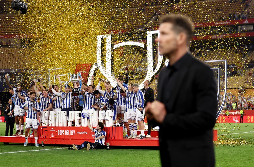 Trebuia să fie săptămâna mare a lui Cholo Simeone. A fost însă a lui Pellegrino Matarazzo, primul antrenor american câștigător al unui trofeu major în fotbalul european care contează. Licențiat în matematică aplicată la Columbia University, Matarazzo a izbutit să pună cap la cap toate necunoscutele din vestiarul lui Real Sociedad și să rezolve o ecuație prea grea pentru cei de dinaintea lui, dar și pentru Cholo. Simeone s-a trezit îmbrăcând pentru această finală într-o ținută ce l-a încorsetat vizibil, cea de favorit. Obișnuit de atâta amar de vreme cu o retorică pe care nimeni în afara fanilor lui Atletico nu o mai crede, anume că stă pe banca unei echipe populare, care trebuie să muncească din greu pentru rezultate mari, eventual apelând la clasicul eroism, antrenorul argentinian s-a izbit de realitatea pe care o pregătește el multor rivali. Pesemne că a înțeles acum ce complicat e să construiești, ce dificil e să ai inițiativa, să găsești culoare prin pădurea de picioare ce-ți stă în față, ce greu e să înoți împotriva curentului și să ai în față un adversar dârz, extrem de motivat, mult mai proaspăt din punct de vedere fizic și extrem de amenințător pe contraatac. Ai zice, parcurgând ultimele rânduri, că e vorba de Atletico, nu? Așa a fost însă Real Sociedad în mare parte sâmbătă seară.